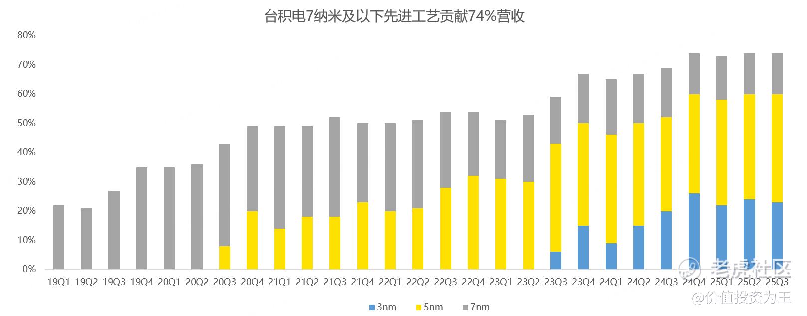 从生产工艺上看,今年四季度,台积电最先进的2纳米工艺量产,明年收入贡献度有望大幅提升。届时,7纳米及以下先进工艺贡献的收入会更高: