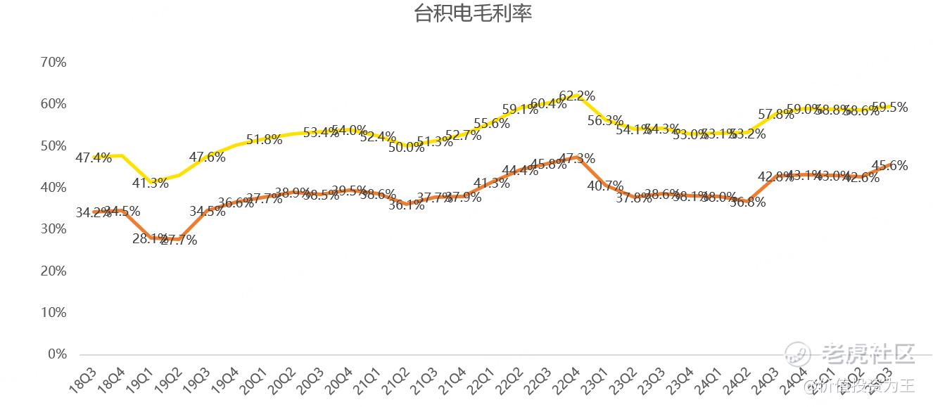 一般而言,工艺越先进,台积电的盈利能力也越高,今年三季度,台积电毛利率为59.5%,净利率为45.6%,明显高于2021年时的水平: