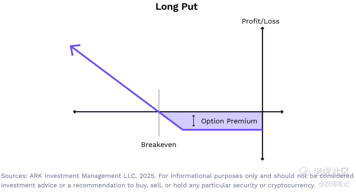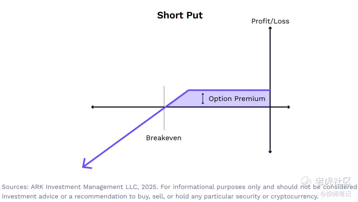 相对地,卖出看跌期权(简单理解就是看涨)意味着承诺在标的资产跌破行权价时买入。当标的资产维持在行权价上方时,卖出看跌期权获利,最大收益即为收取的期权费。但需注意,随着资产价格下跌,下行风险呈线性增加——这是一种具有显著风险的看涨策略。
