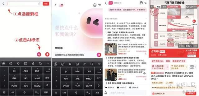 我们实际使用了一下这个功能,输入“女款时尚羽绒服,含绒量超过90%,保暖效果好”的要求,智能助手经过短暂思考,很快给我们推荐了几款符合要求的产品。每一款产品,它都根据消费者过往评价,给我们总结并列出了设计特点、含绒量等指标、适配场景、适合人群等信息,还分别给出了购物车链接,可直接选购。
