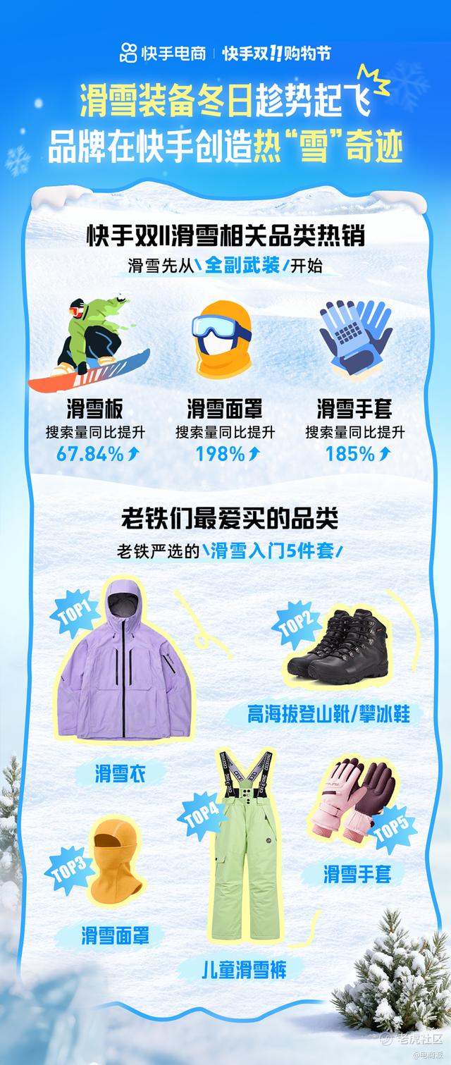 快手公布的电商销售数据也印证了冰雪经济的火爆。据了解,今年“滑雪五件套”提前热卖,平台上滑雪衣销售额同比增长288倍,攀冰鞋等滑雪相关鞋靴销售额同比增长284倍,滑雪裤销售额同比增长247%,滑雪面罩、滑雪手套销售额分别同比增长198%、185%,滑雪板销售额同比增长68%。