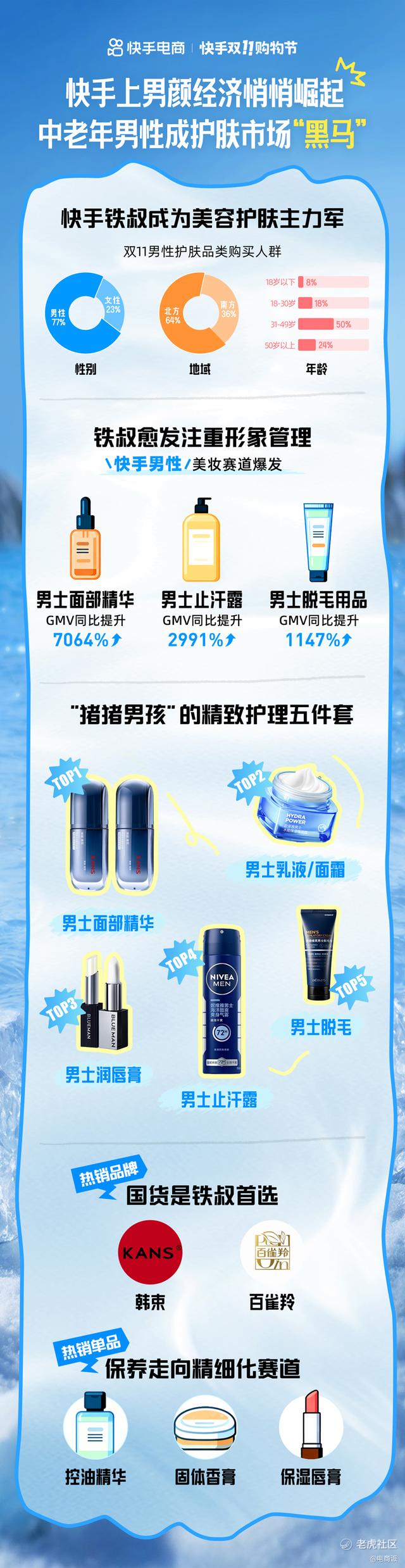 快手双11期间,男士面部精华销售额同比暴涨超70倍,男士止汗露销售额同比猛涨近30倍,男士脱毛销售额同比增长超11倍。其他像男士润唇膏、爽肤水、化妆水、发胶啫喱这些产品,销售额也都有不同程度的增长。