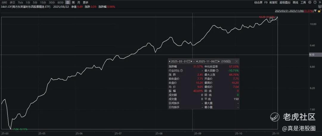 南方东英富时东西股票精选ETF (3441.HK)从3月份发行以来,年内回报已达31%,虽然持仓股票看着保守,但实际上的回报并不输给市场,尤其是近期港美股回调的情况下,高自由现金流的公司成了资金短期的避风港,近期还是继续涨的。