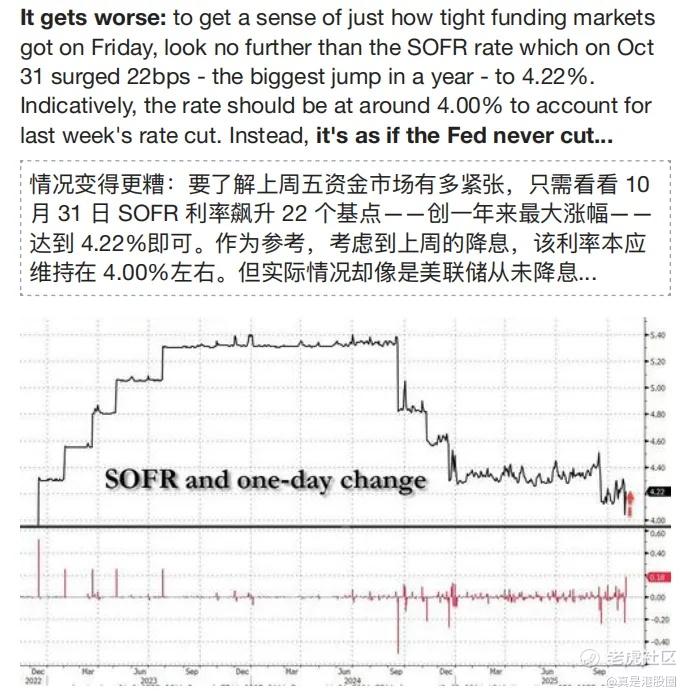 从下图中看,根据外媒统计的数据,10月31日的SOFR利率(国债作抵押的隔夜回购利率)飙升22个基点,创一年来最大的涨幅达到4.22%;值得注意的是,考虑到美联储10月的降息,该利率本应该维持在4%左右,但实际情况却像是美联储从未降息。