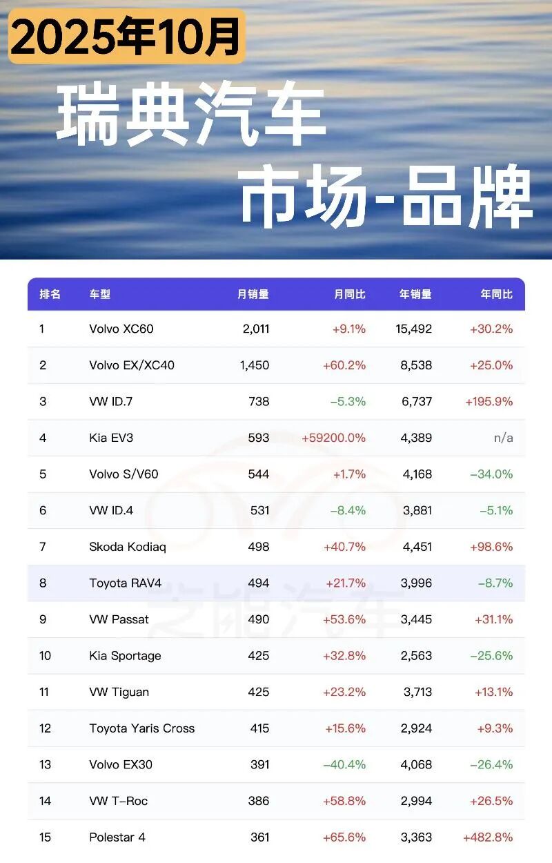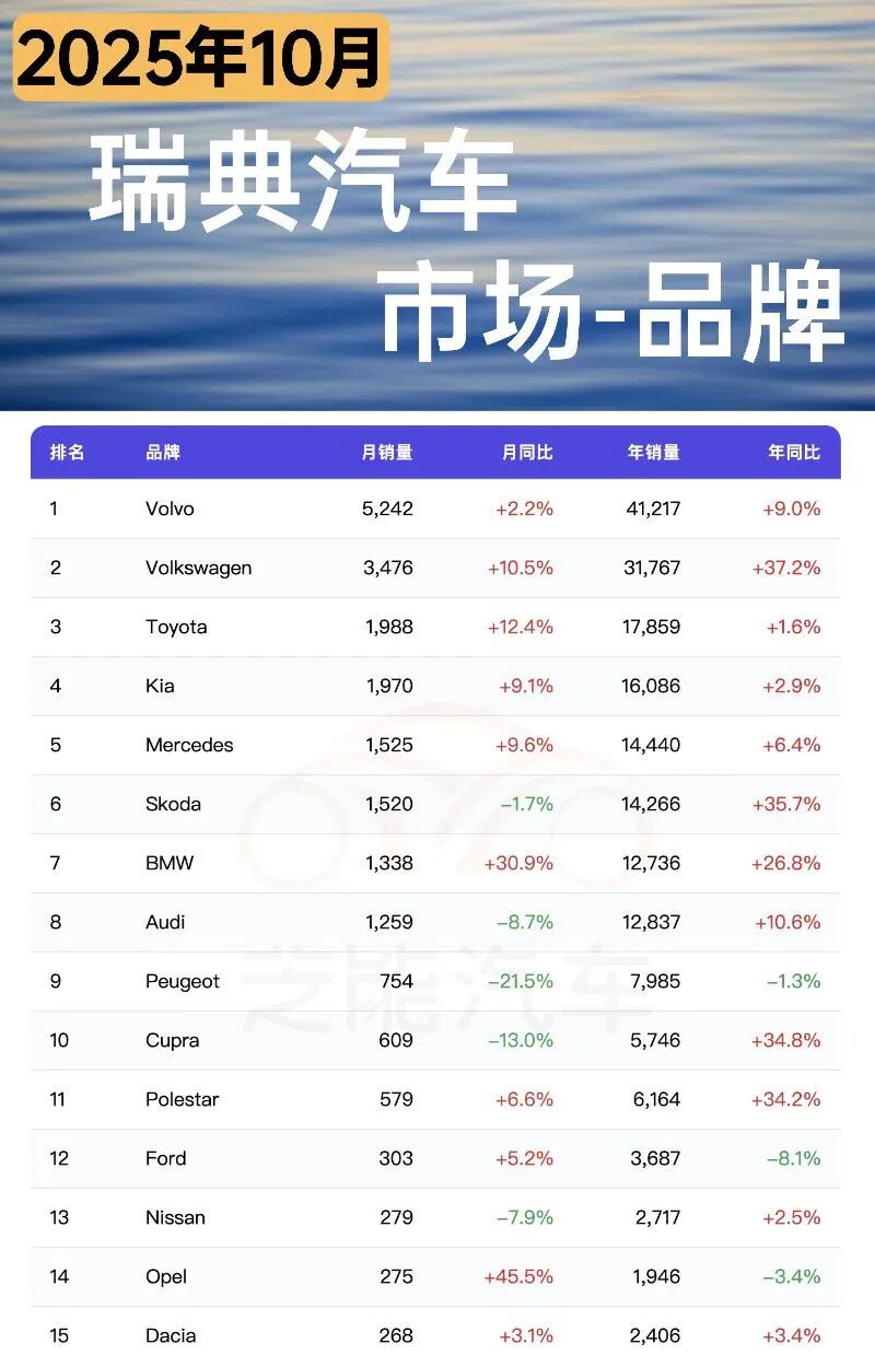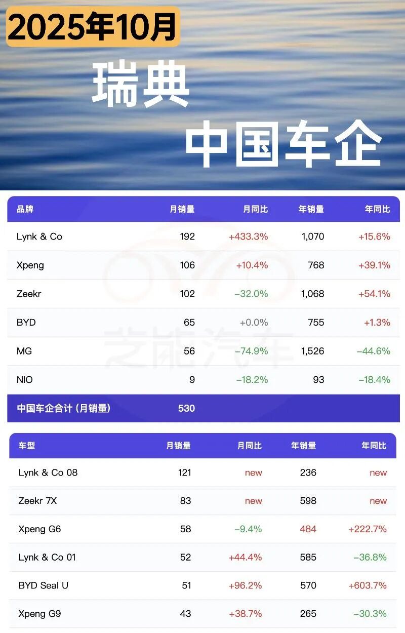 瑞典市场在2025年10月中国车企表现很有限,销量也不大。
