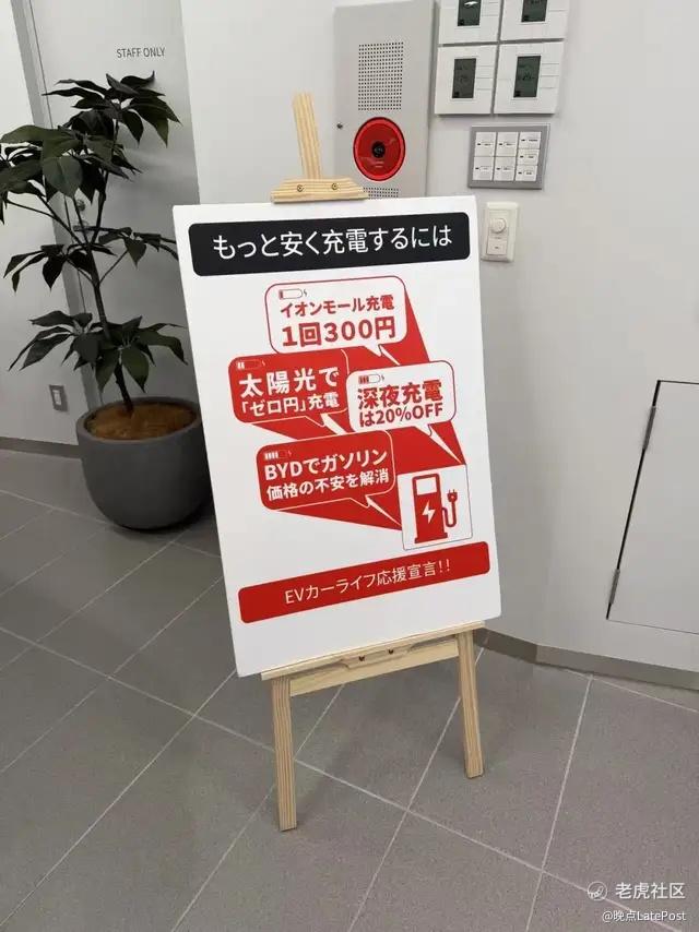 一家比亚迪日本门店用立牌解释如何 “更便宜地充电”。图源:晚点 Auto
