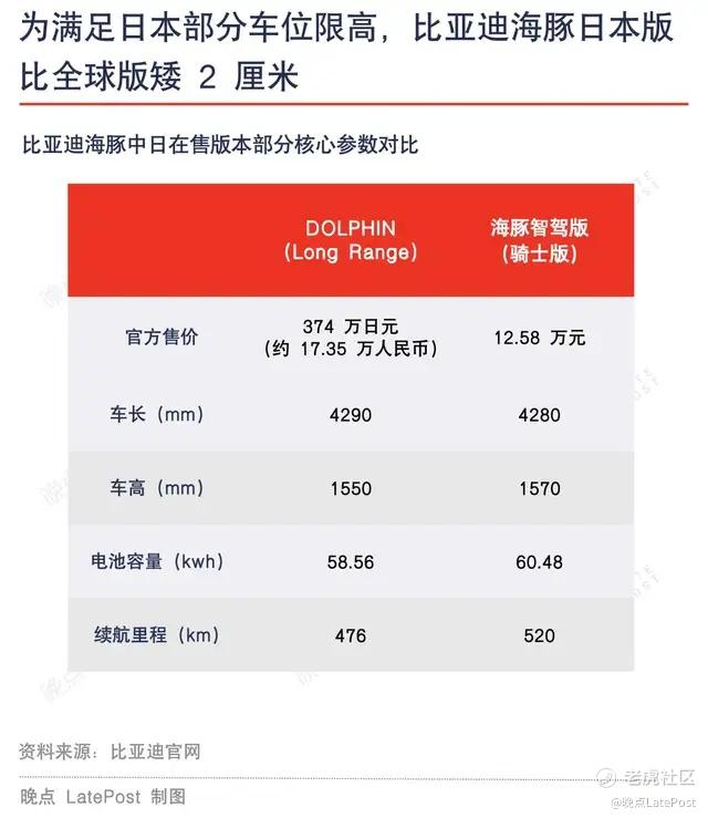 日本立体机械车库大多有 1550mm 的限高要求,所以全球版和中国版的海豚高度为 1570 mm,但日本版本降到了 1550 mm。比亚迪在 2023 年的新车上市新闻稿里专门提了这一点。