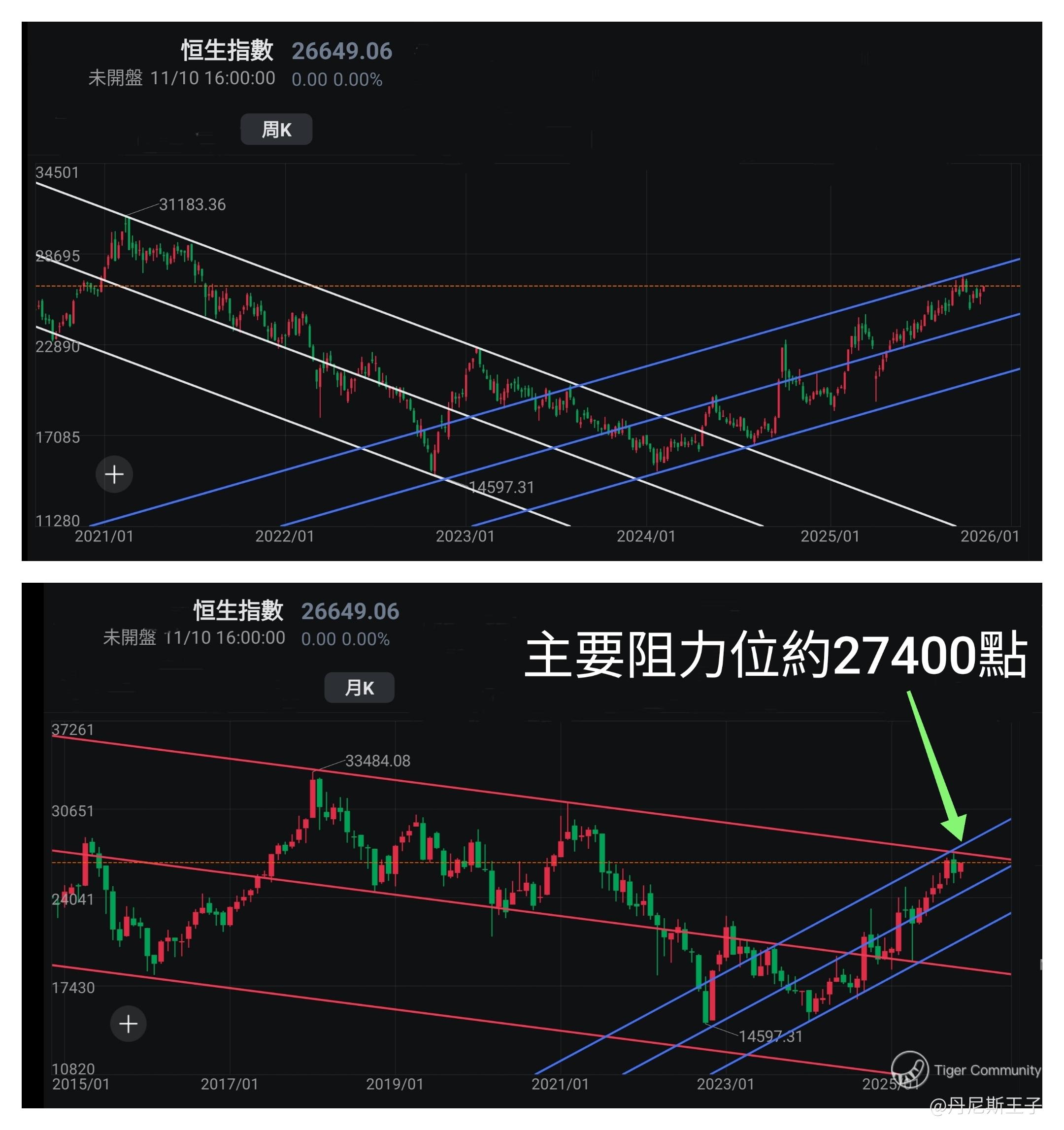 从恒生指数周线图和月线图所见,主要阻力位是27400点。