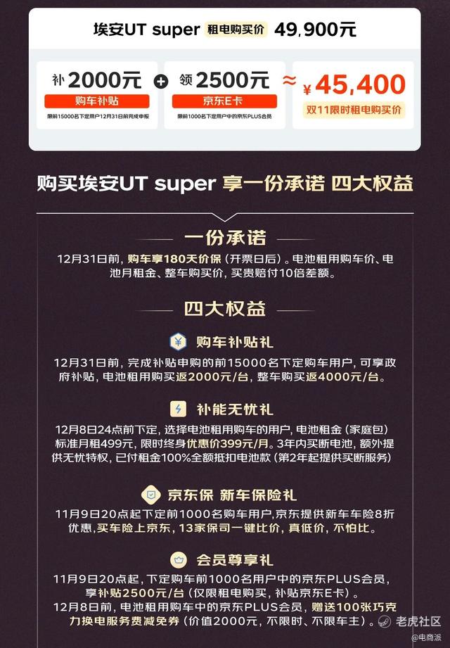 埃安UT super的定价瞄准了中国新能源汽车市场最为竞争激烈的10万元以下细分市场,这是比亚迪海鸥、五菱缤果S等热门车型的主战场。此时京东祭出4.99万元电池租用方案,以超低的入门价,对于预算有限但又想尝鲜新能源的消费者,确实很诱人。