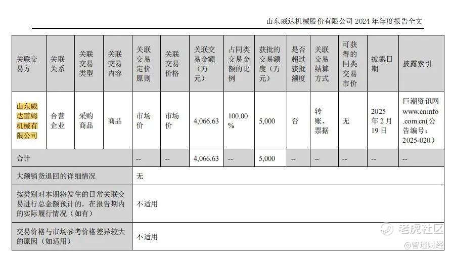 需要注意的是,2024年年报显示,山东威达与山东威达雷姆机械有限公司关联交易金额达4066.63万元,较上年同期还提高了15.54%。