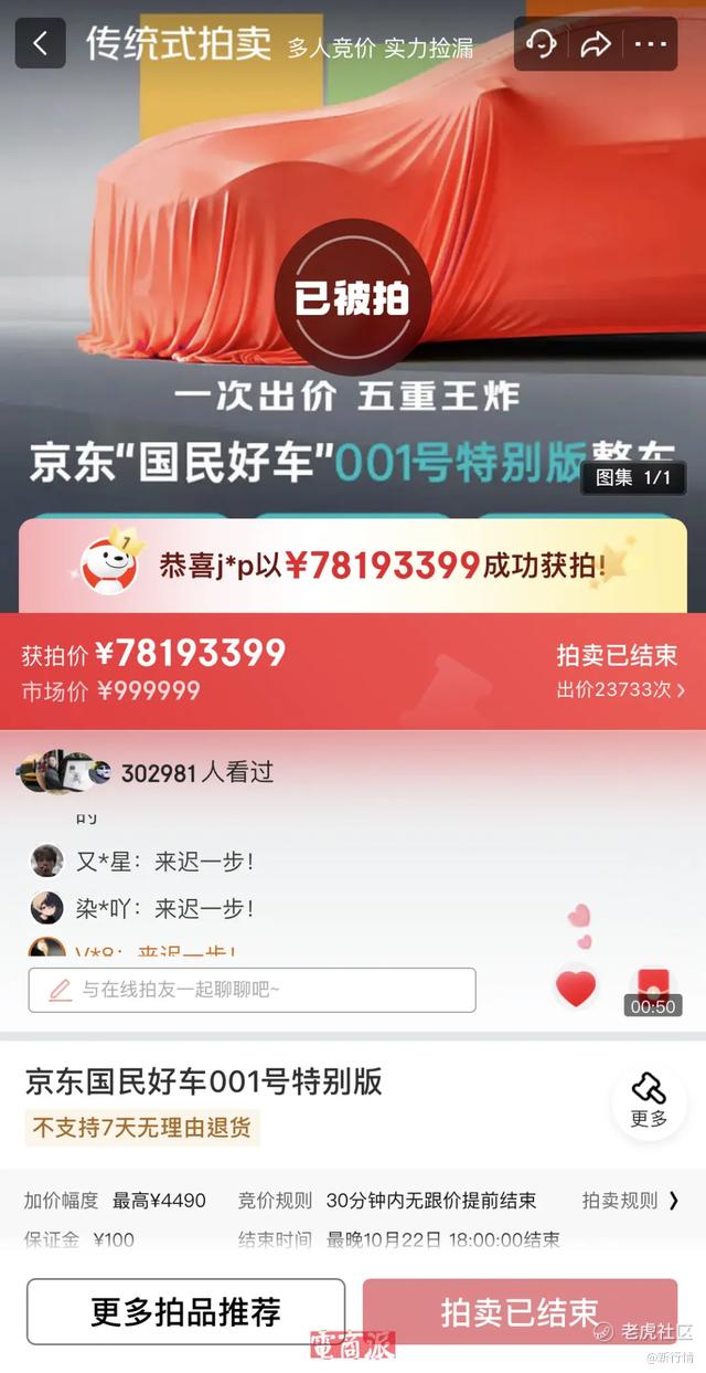 而后,京东回应天价拍卖事件称正联系出价者,若用户未支付将妥善处理车辆;同时承诺向所有出价用户赠399元新车礼包(购车后兑现),并向出价最接近最终售价者送一辆车,进一步点燃市场热情。
