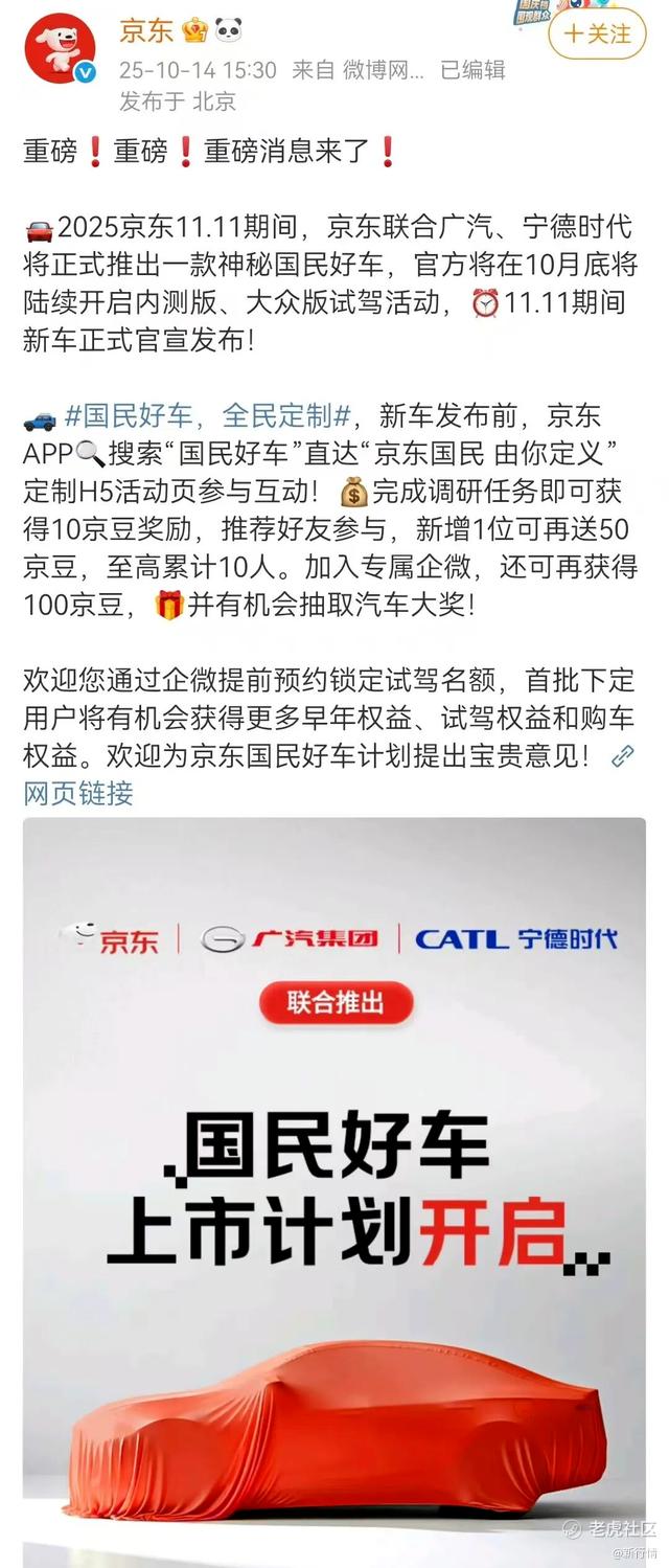 一开始,京东直接平地一惊雷,突然宣布联合广汽集团、宁德时代推出“国民好车”:京东依托大数据洞察用户需求,搭建线上线下一站式购车与售后体系;广汽负责整车研发制造,把控品质与性能;宁德时代提供专属动力电池方案,保障续航、安全与补能便捷性。三方协同发力,精准满足消费者对高性价比新能源汽车的需求。