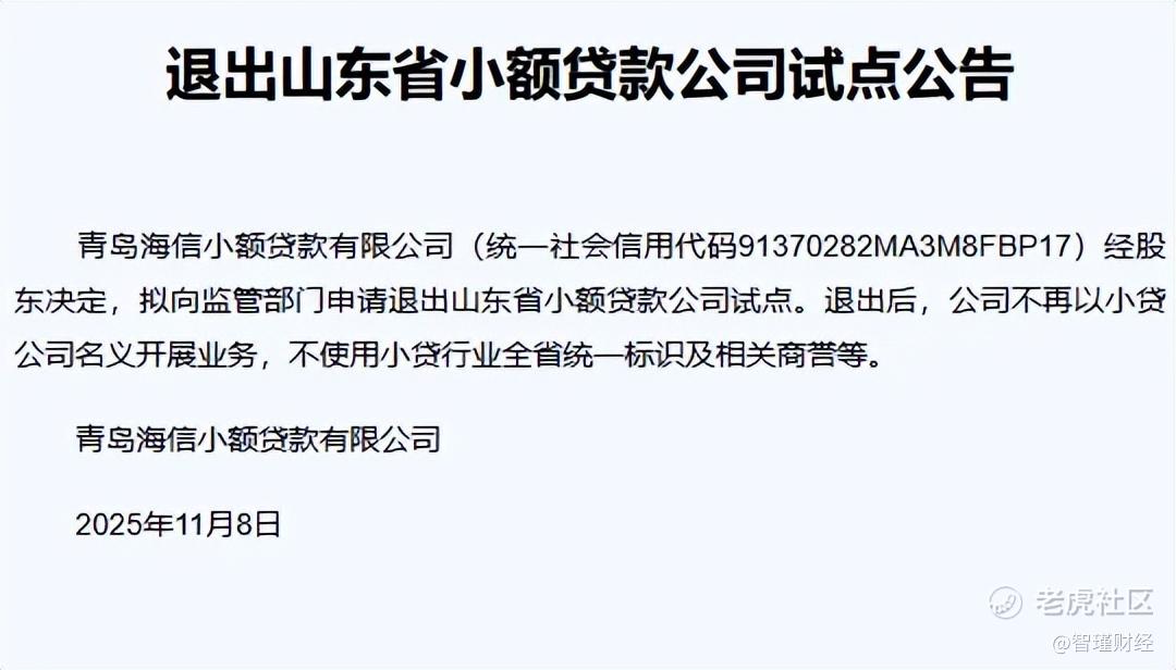 11月8日,青岛海信小额贷款有限公司宣布,将退出山东省小额贷款公司试点。经股东决定,拟向监管部门申请退出山东省小额贷款公司试点。退出后,公司不再以小贷公司名义开展业务,不使用小贷行业全省统一标识及相关商誉等。