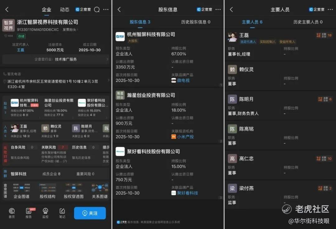 企查查信息显示,浙江智屏视界科技有限公司(下称 “浙江智屏”)于 2025 年 10 月 30 日成立,注册资本 5000 万元。其经营范围涵盖技术服务、技术开发、技术推广,以及人工智能软件开发、计算机硬件批发等业务。