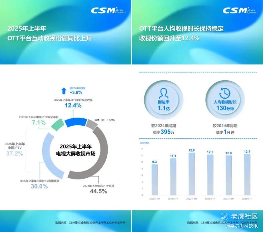 工信部数据显示,2025 年上半年,互联网电视(含 IPTV、OTT)用户规模达 4.11 亿户。另据 CSM 重点城市调研数据,电视大屏 OTT 平台互动收视份额为 12.4%,同比提升 3.8 个百分点,呈现小幅回升态势。