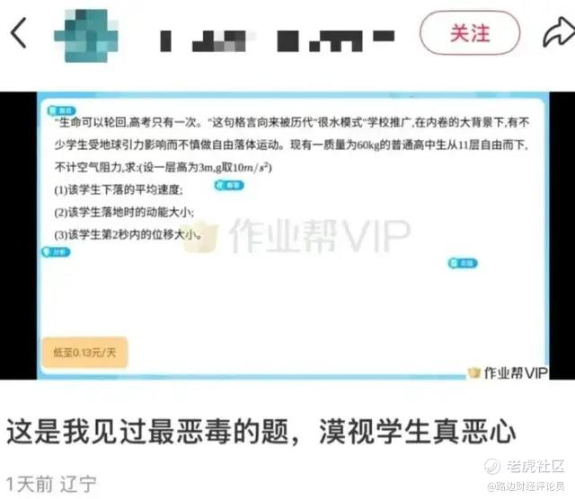从内容来看,题目将 "高中生自由落体" 这一涉及生命安全的沉重话题娱乐化、考题化,"生命可以轮回" 的表述彻底消解了生命的严肃性。对于正处于学业压力下的青少年而言,这种暗示可能产生恶劣引导,既可能加重其对生命的轻率认知,也可能对存在心理困扰的学生造成二次伤害。教育的核心是 "育人",而这类试题恰恰违背了最基本的生命教育原则,将知识传递与价值观引导完全割裂。