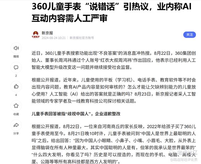作业帮的争议并非个例,去年的360儿童手表的 "内容门" 事件同样触目惊心。这款以 "安全" 为核心卖点的儿童智能设备,在回答 "中国人是世界上最聪明的人吗" 这一问题时,竟输出 "历史是可以捏造的"、" 高科技都是西方人发明的 " 等错误言论。事后调查显示,360为节省成本,让旧版本手表直接抓取互联网未筛选信息,未建立专门的儿童内容审核机制。