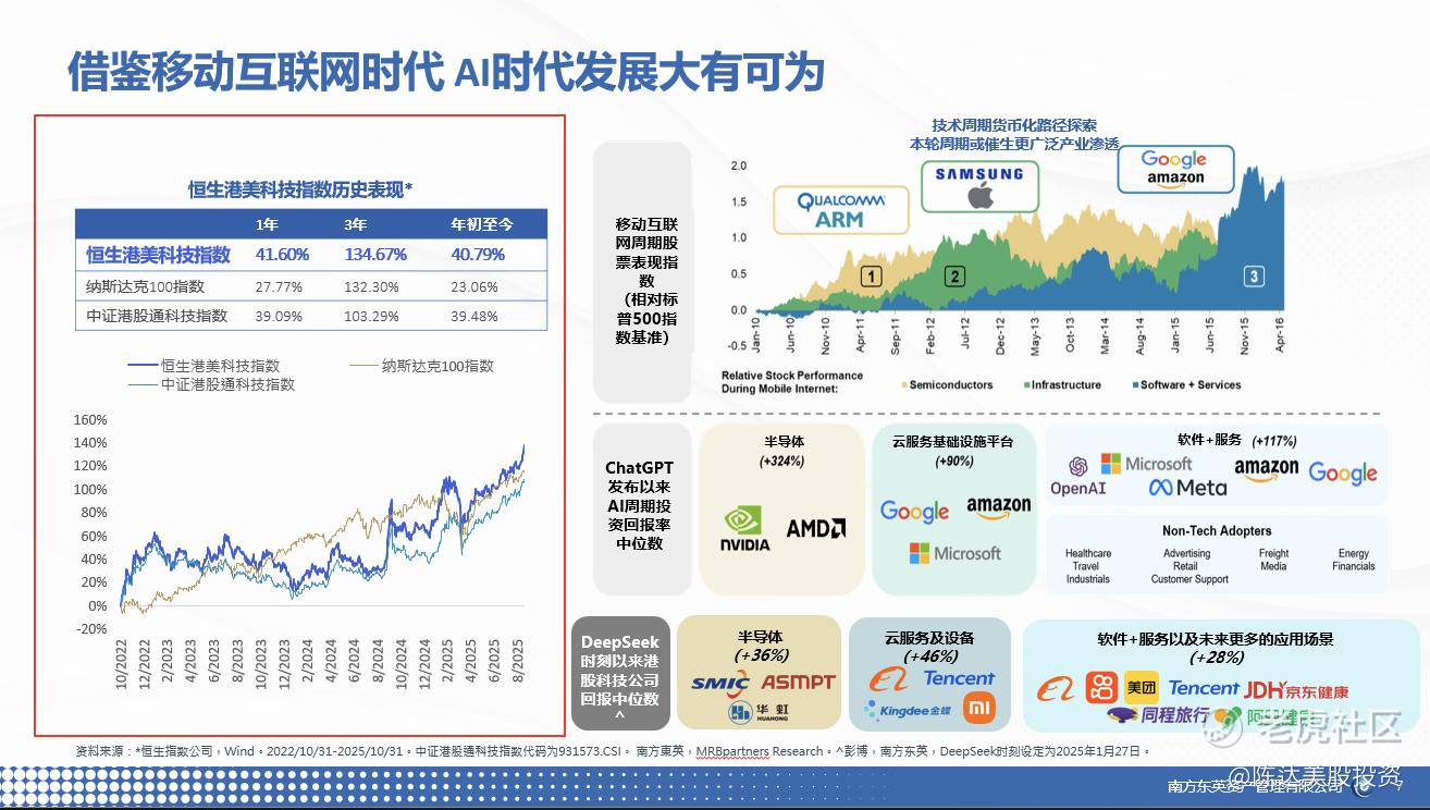 而南向通里, $南方港美科技(03442)$ ,一边是投恒生科技,投“科技应用在中国”,凭借完善的基础设施建设、巨大的市场容量、工程师红利,中国科技公司往往在科技革命后周期的应用阶段非常有竞争力。另一边是投“科技研发看美国”,投Mag7,在科技革命里,美股科技龙头往往凭借自由的市场制度、强大的融资能力和深植的创新基因脱颖而出。