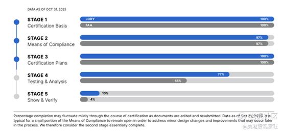 Joby Aviation面临的主要风险与适航认证相关。其获取机型适航认证的进程,仍取决于能否完成认证第三阶段(截至2025年10月31日,Joby Aviation完成度为77%,FAA完成度为55%),并加快推进第四阶段(Joby Aviation完成度为10%,FAA完成度为4%)。