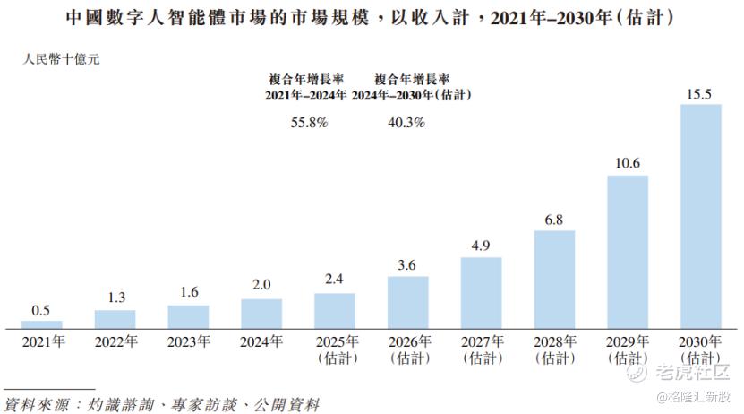 从收入来看,中国数字人智能体市场规模从2021年的5亿元增加至2024年的20亿元,复合年增长率为55.8%;预计到2030年将达到155亿元,2024年至2030年的复合年增长率为40.3%。