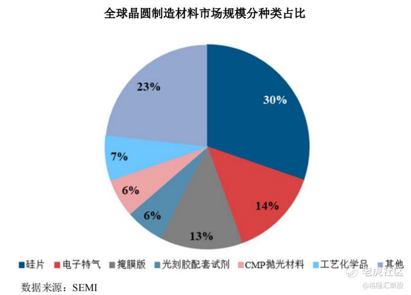 半导体硅片为晶圆制造材料的主要组成部分,占比为30%。