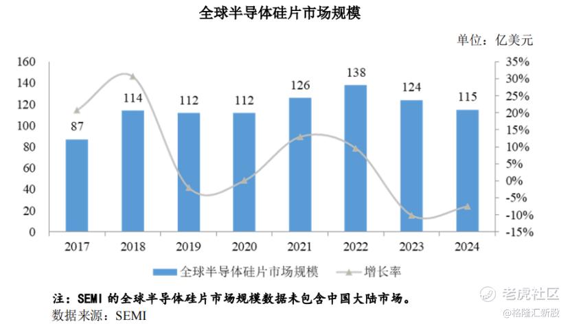 受半导体终端需求疲软和宏观经济的影响,2024年全球半导体硅片市场规模同比下降7.50%至115亿美元,但受新能源汽车、5G移动通信、人工智能等终端市场的驱动,半导体行业于2024年开始回暖。