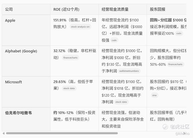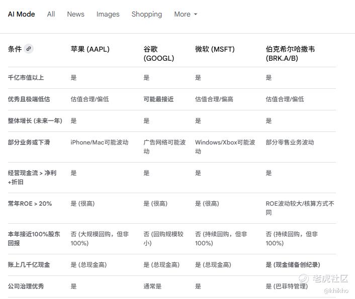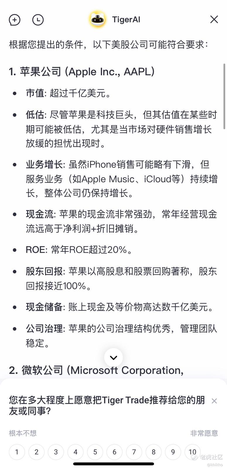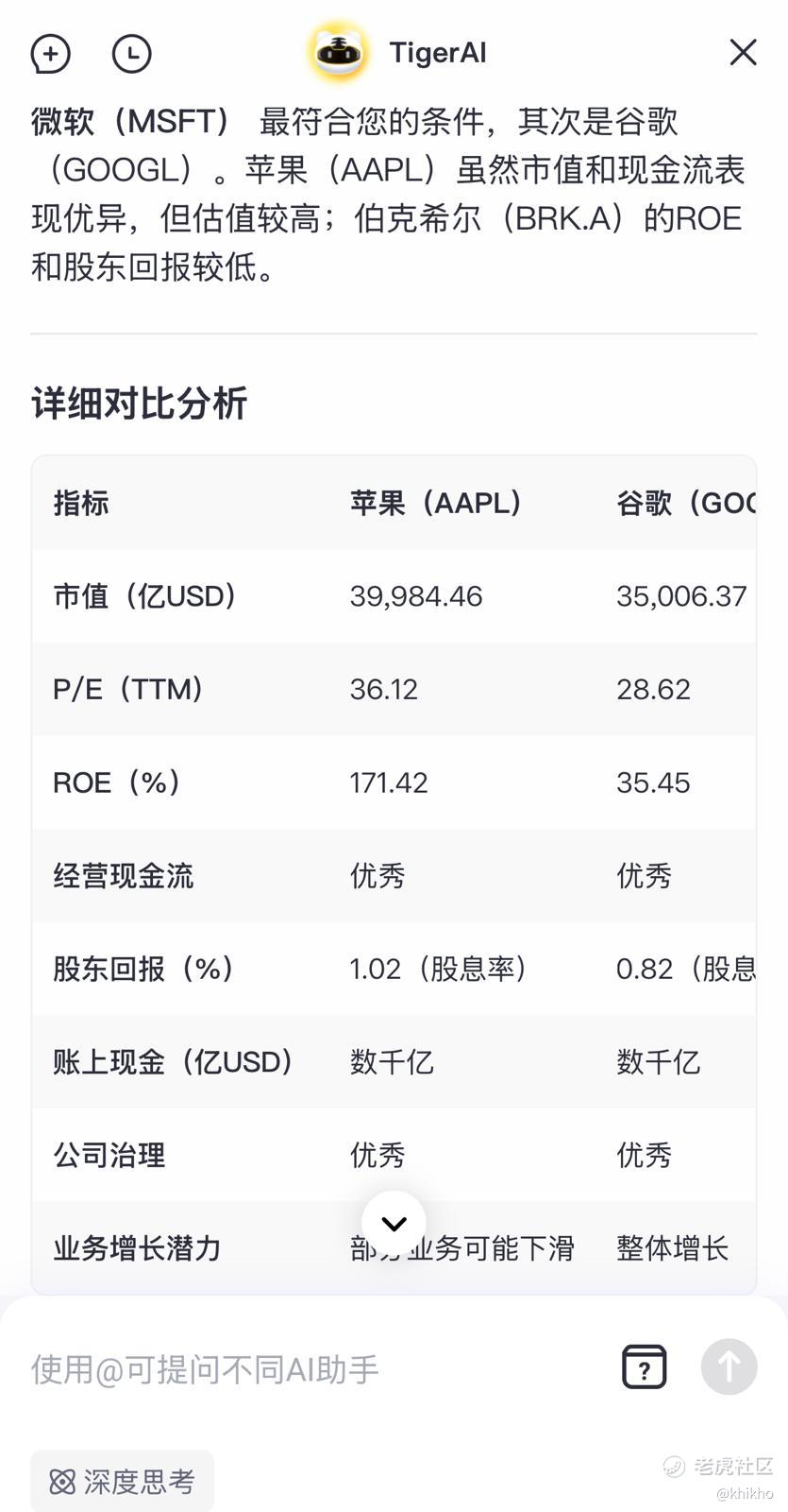 还有我们的TigerAI,给出了好几个可能的答案,分别是 $苹果(AAPL)$ , $微软(MSFT)$ ,还有 $伯克希尔(BRK.A)$ , 还有谷歌。并说这些公司多多少少都符合条件,尤其是苹果和微软,在业务增长,现金流,ROE和股东回报这些方面的表现尤为突出。