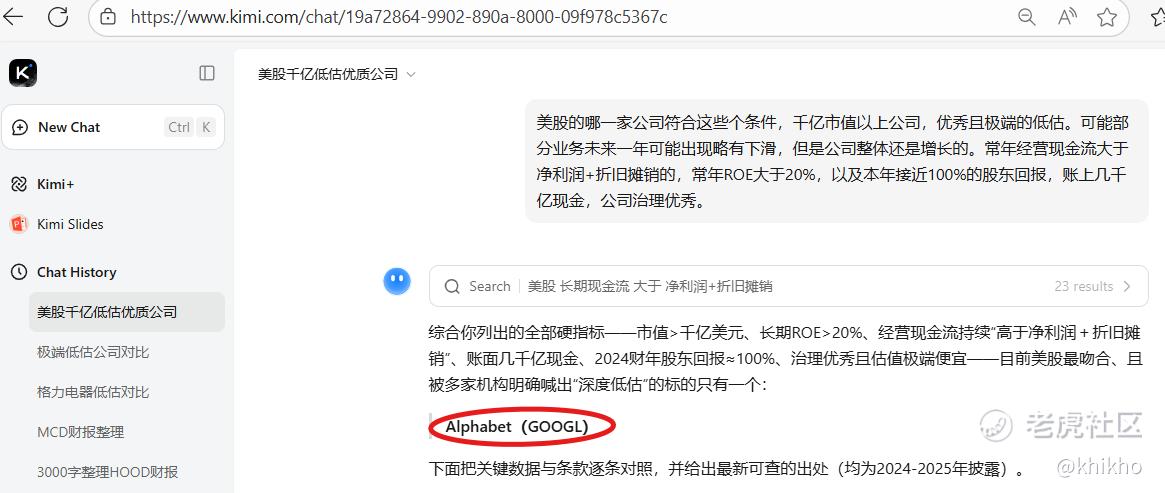 Kimi的答案是 $谷歌(GOOG)$ ,并声称在“千亿市值、高ROE、现金流狂飙、账上巨额现金、几乎全额回购”这一豪华组合里,目前被一致预期“估值极端低”且治理评分最高的,几乎只有Alphabet。若未来一年搜索广告确如预期小幅减速,而云与AI服务继续放量,其“盈利整体仍增长+超高股东回报”的逻辑不会被打破,估值修复空间也最大。还说 如要寻找“符合所有硬条件且最被低估”的美股巨无霸,GOOGL几乎是唯一解。