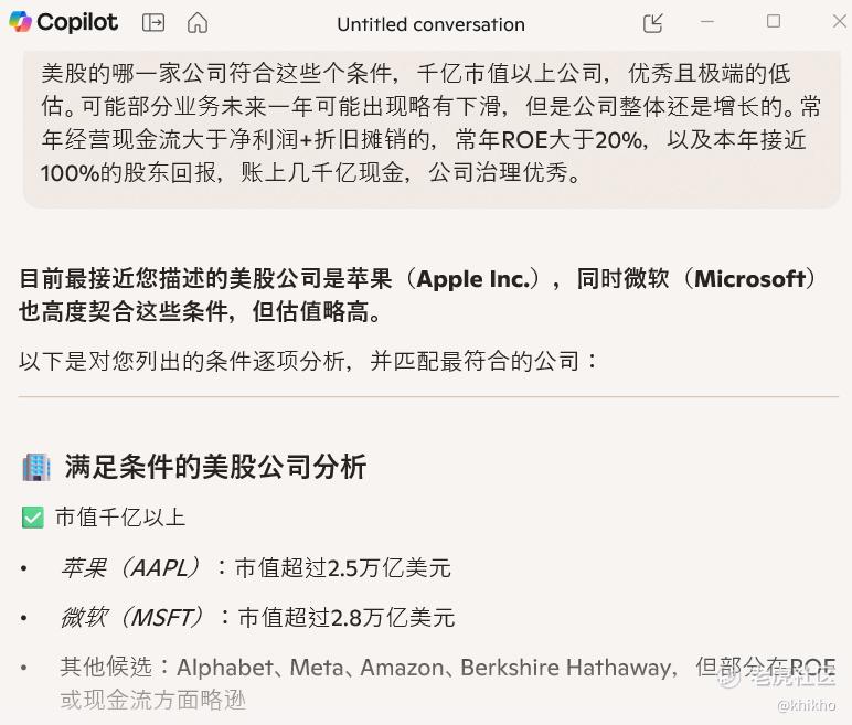 再看看Copilot的答案,他说最符合条件的公司是Apple,次选是Microsoft(MSFT),然后是Alphabet(GOOGL),最后才是现金王,伯克希尔哈撒韦(BRK.A),因为BRK.A的ROE低,股东回报率低,不符合“极端低估+高回报”逻辑。