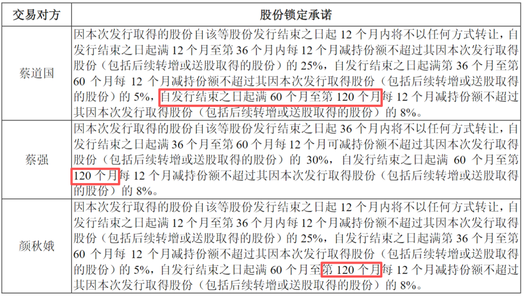 罕见的是,此次远东股份向蔡道国方发行的股份,被要求的锁定时间最长达到了10年,远超监管部门要求的12个月。远东股份公告的发行报告书显示,蔡道国、蔡强、颜秋娥“自发行结束之日起满60个月至第120个月,每12个月减持份额不超过其因本次发行取得股份(包括后续转增或送股取得的股份)的8%”。