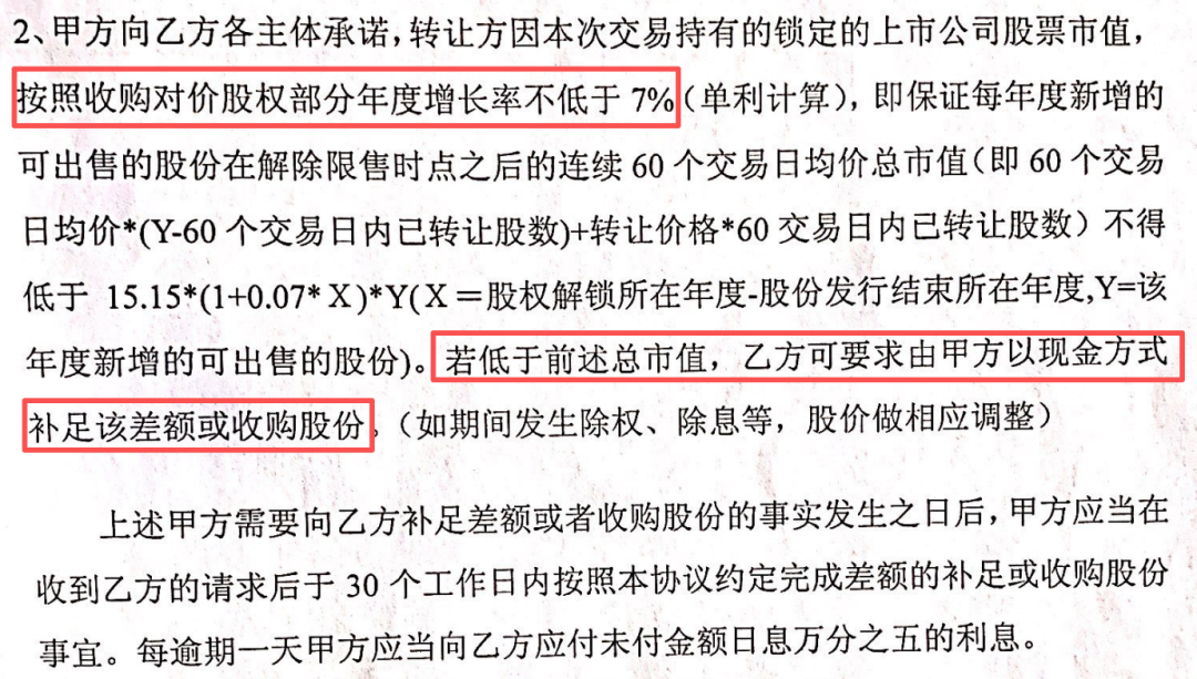 补充协议约定了蔡道国方股份解禁后不达预期收益的差额补足条款,核心内容是:锁定股份可变现市值不低于收购时的发行价加每年7%的增长,差额部分由远东控股以现金方式补足或收购股份。远东控股应在收到蔡道国方请求后的30个工作日内履约,如逾期则按应付未付金额日息万分之五支付利息。