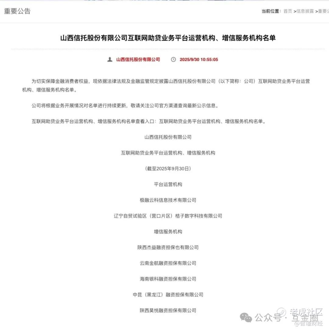 《监管收紧!仅8家信托披露助贷合作方,行业透明度亟待破局》(此外,还有——山西信托、粤财信托也完成了披露。)