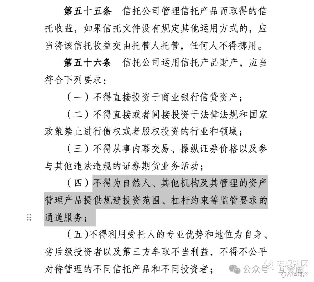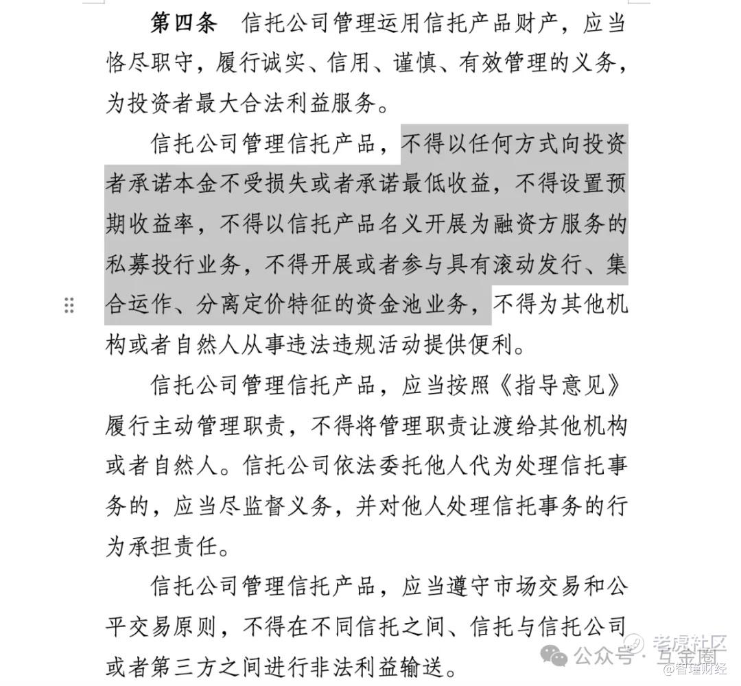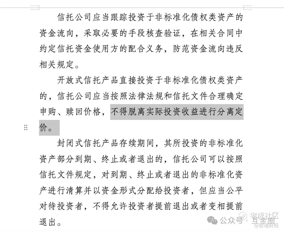 第四十六条:开放式信托产品投非标债权,不得脱离实际投资收益进行分离定价。