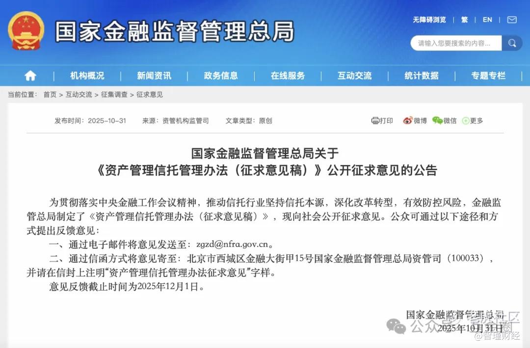 近日,国家金融监督管理总局发布《资产管理信托管理办法(征求意见稿)》(下称《办法》),全文共85条。《办法》明确严禁信托公司开展通道类业务和资金池业务,同时强化了信托公司在产品管理中的主动管理责任。