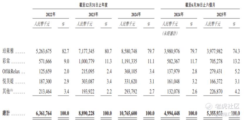 按品牌划分,2022年至2025年上半年(简称“报告期”),珀莱雅品牌为公司贡献了70%以上的收入,占比较大;彩棠、off&relax等子品牌的收入占比有所提升,但占比相对较低。