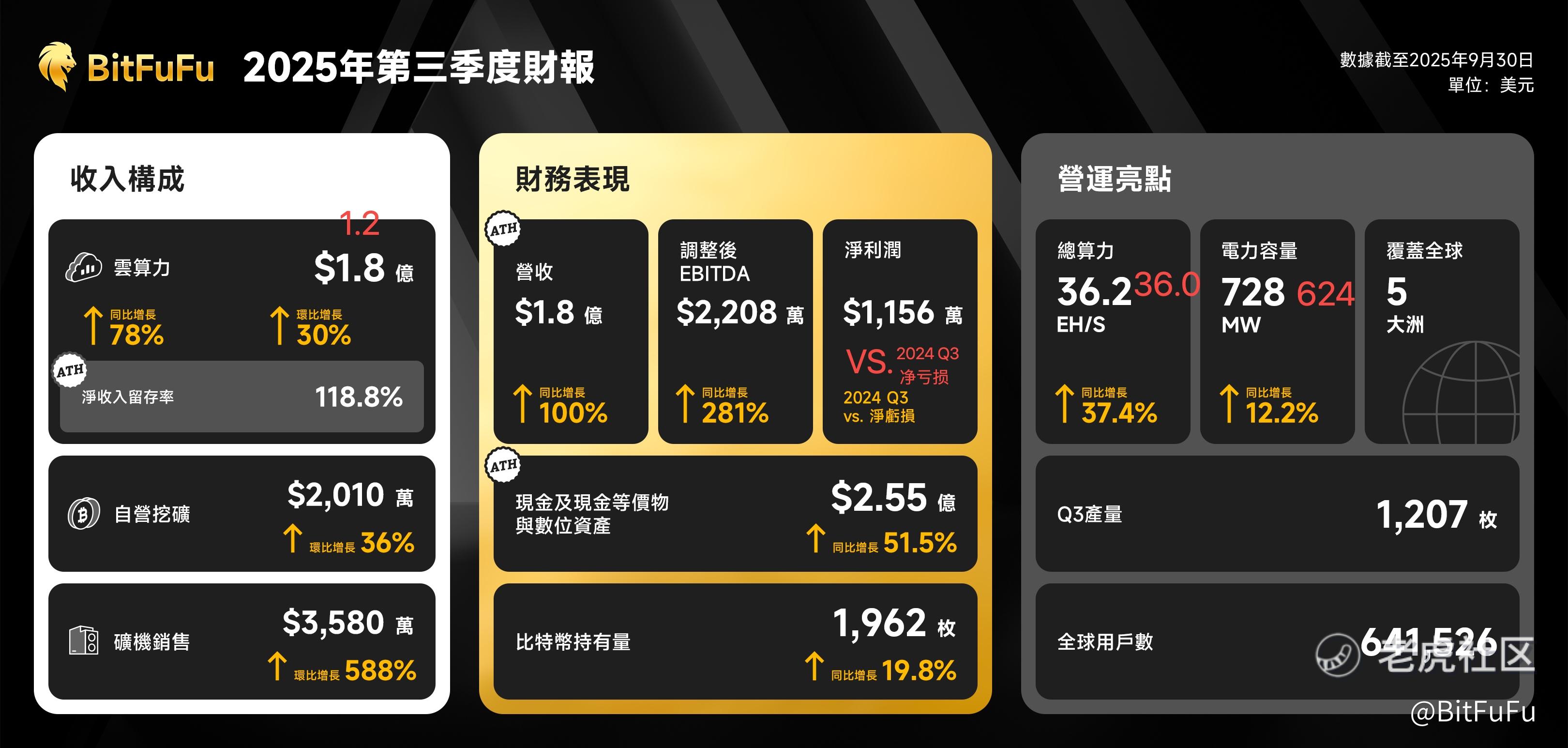BitFuFu于2025年第三季度持续展现强劲表现,实现三位数的收入增长,主要受益于云算力、自营挖矿及矿机销售业务的全面增长。公司第三季度美元净留存率(Net Dollar Retention Rate)达到118.8%,显示出稳定的客户参与度与持续的复购需求。公司对全球云算力市场的长期潜力保持坚定信心。
