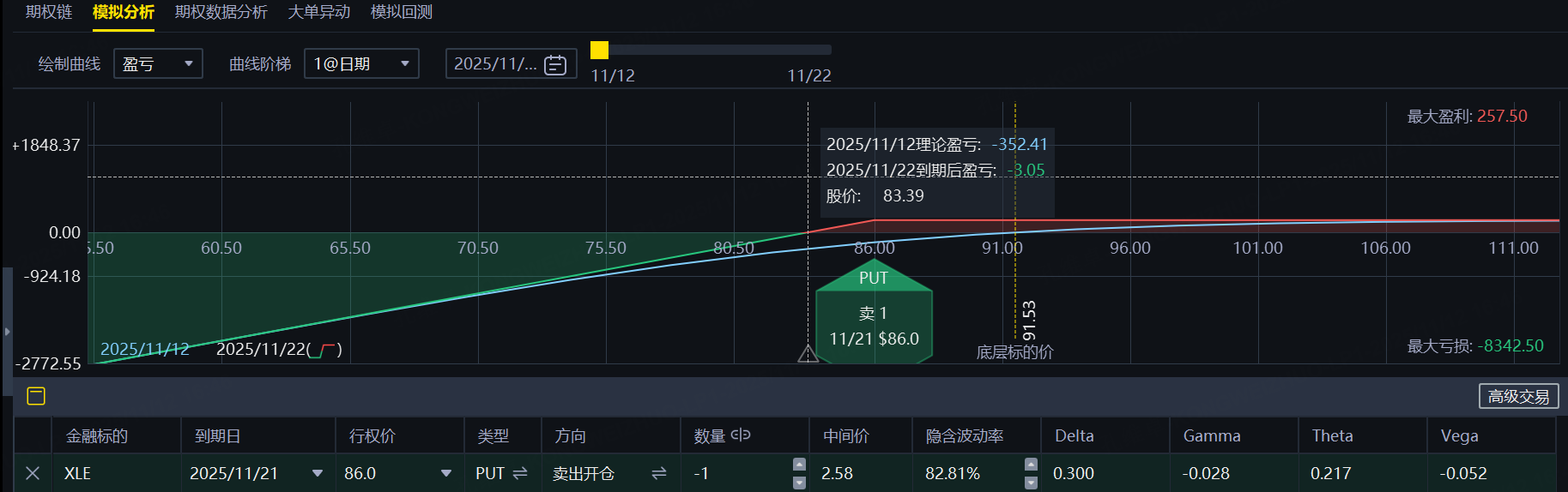 以九天后到期的执行价格是86的XLE的put的策略来看,这个策略到期的理论上的盈亏平衡位置是在83.3上下,只要这个价位在9天后跌不破,则卖出一手put有257.5刀的收益可以获得。