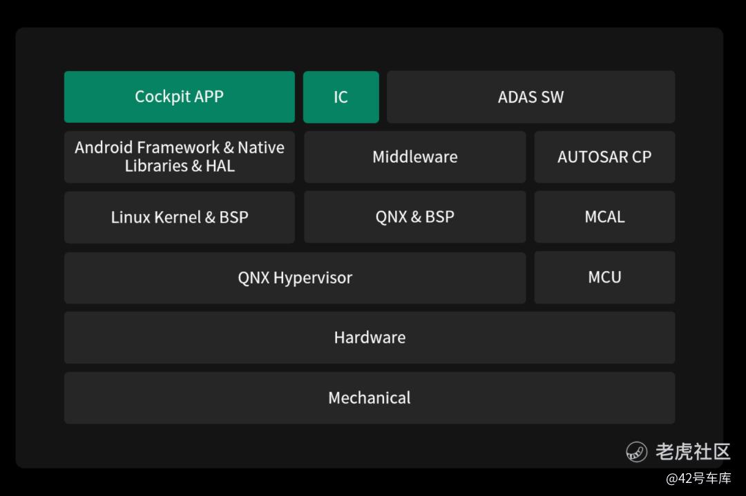 就拿很多现有车型来说,单就一个座舱的系统,它的系统结构设计也并不是单一的。比如很多车看起来都运行着高度定制的安卓系统,但实际上为了确保安全性,整个座舱的系统设计也不是围绕着安卓单一系统运行的,在更底层也有着非常安全的 QNX 系统的配合,来确保即使上层的安卓系统崩溃,也不会在行驶过程中影响底层系统和行车安全。