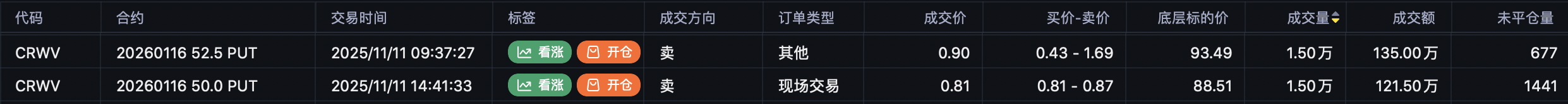 看跌期权以卖出深度价外put为主, $CRWV 20260116 50.0 PUT$ $CRWV 20260116 52.5 PUT$