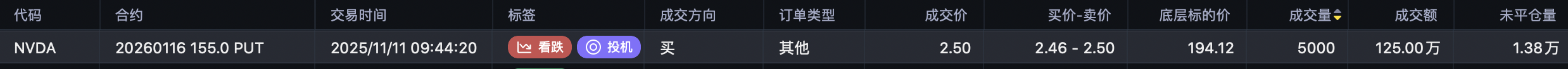 买入看跌期权是买入155put $NVDA 20260116 155.0 PUT$ ,成交量5000手,成交额125万。