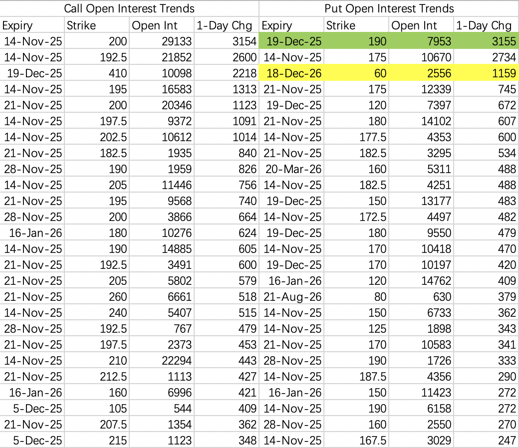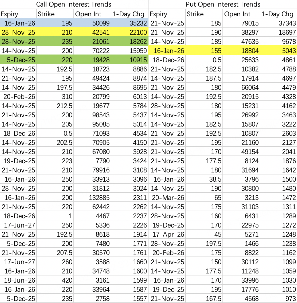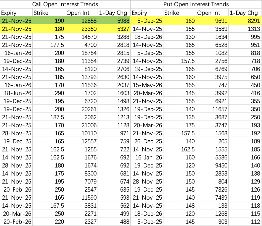 阿里开仓多空都有,看涨大单是买入180call $BABA 20251121 180.0 CALL$ 卖出190call $BABA 20251121 190.0 CALL$ ,不过总成交额比较低,看多情绪不强。