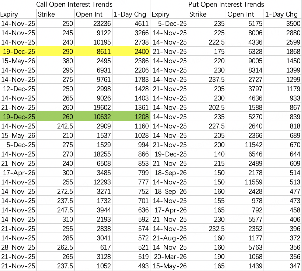 有个很极限的看空大单,卖出260call $AMD 20251219 260.0 CALL$ ,买入双倍290call $AMD 20251219 290.0 CALL$ 。我感觉今天开仓比较合适,下跌时不适合做sell call。