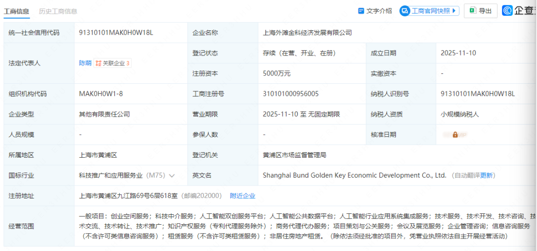 企查查信息显示,上海外滩金科经济发展有限公司(以下简称外滩金科)已注册成立,成立日期为11月10日,注册资本为5000万元,法定代表人为陈萌。同时,该公司股东包括上海黄浦科创集团有限公司和上海信托。