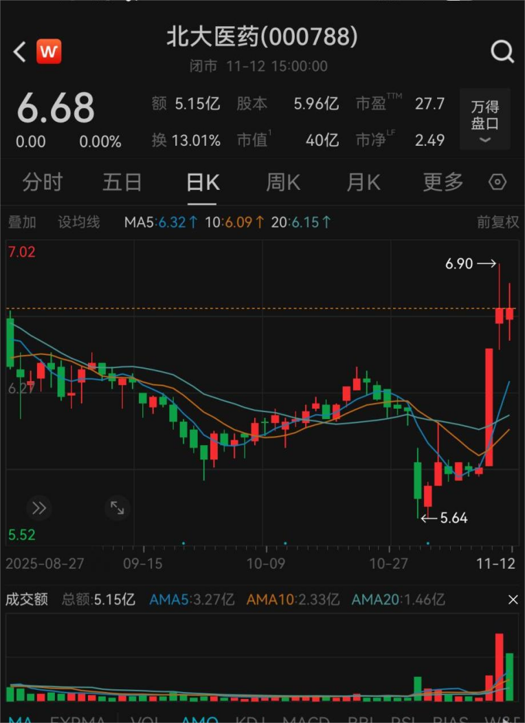 截至11月12日收盘,北大医药每股报6.68元,总市值为40亿元。