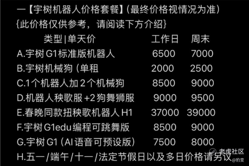多名人形机器人租赁商向《豹变》反映,基于不同的需求,宇树G1、众擎PM01等中等型号的机器人,单日租金一般在4000-6000元左右浮动,若搭配演出服、语音或舞蹈编程等仍需加价。若逢节假日档期紧,费用还会进一步上调。