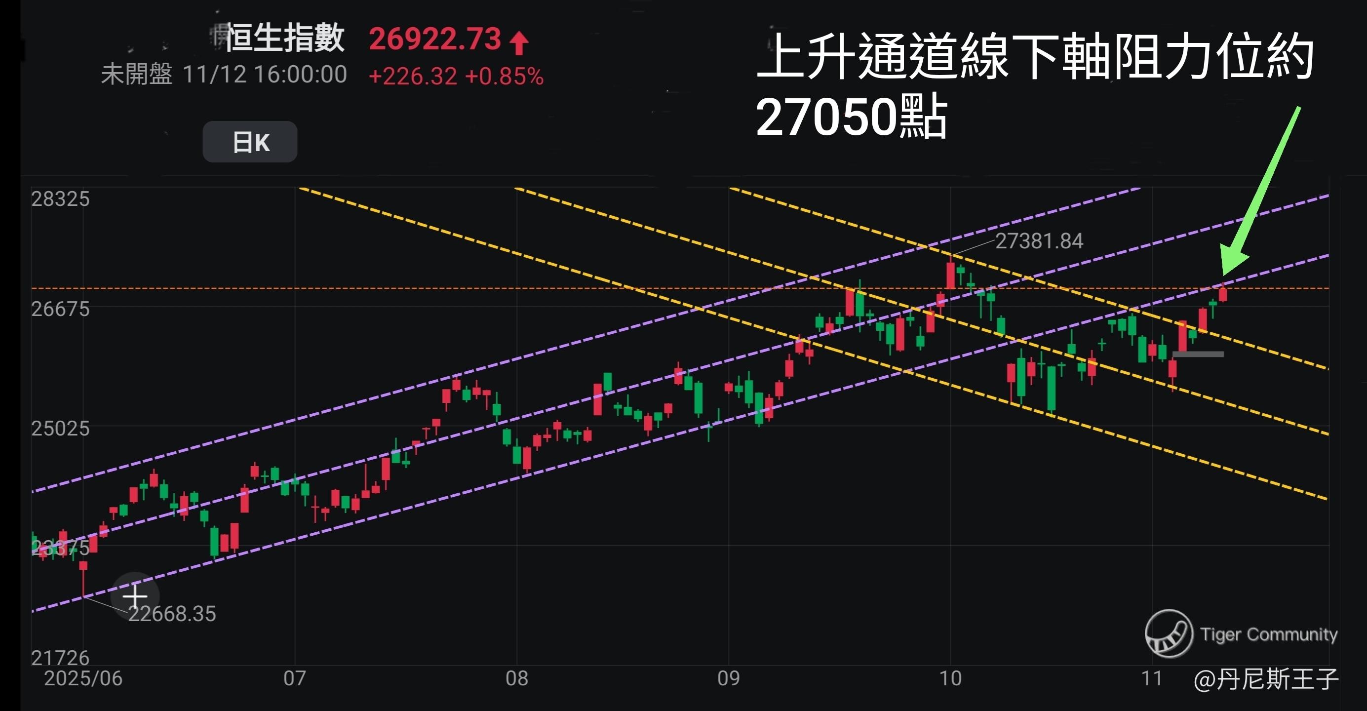 日线图通道线:恒生指数已突破下降通道线上轴,现看能否继续向上走突破上升通道线下轴(约27050点)