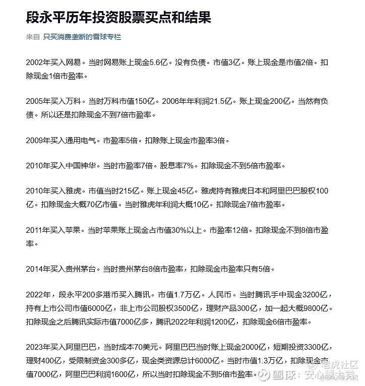 段永平买入股票,主要在扣除净现金、非经营资产后PE10倍以内。