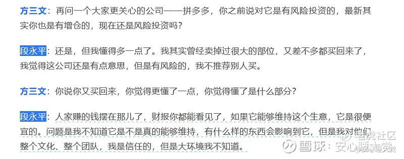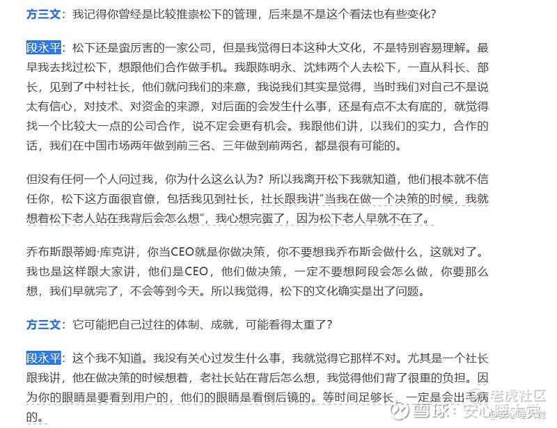 昨天段永平这次与雪球方三文的对话,还是透露了很多我关心的内容。本文不对内容进行总结,只对那些对我有感触收获的内容进行记录分享。