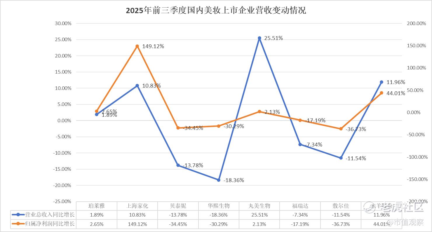 2025年的三季报中,A股美妆企业多数承压,纵览A股美妆八姐妹,前三季度仅有3家实现了净利润正增长,毛利率也有所浮动,其中4家美妆企业的营收处于负增长。
