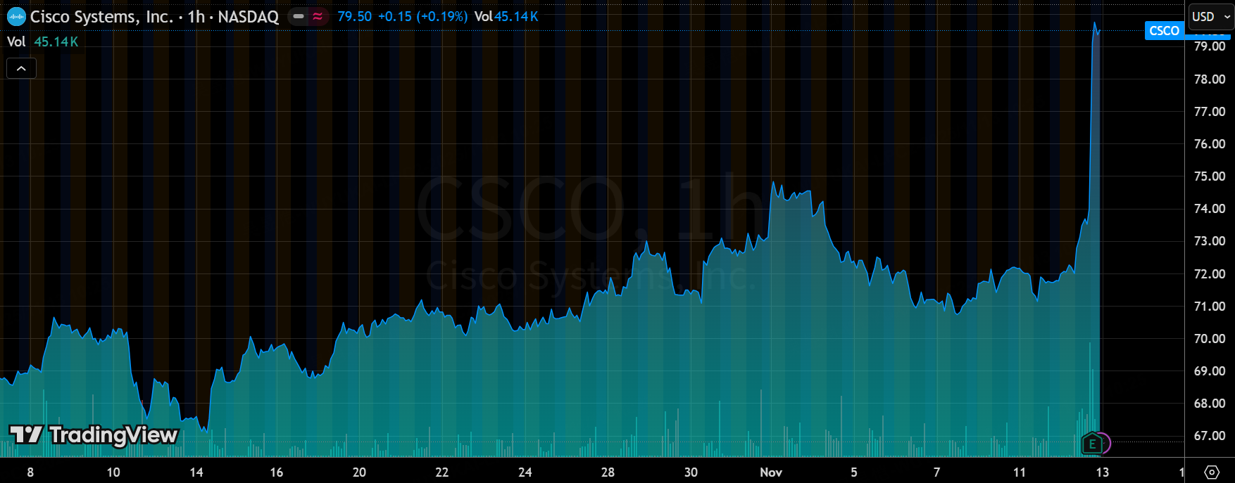 以财报发布前一日(11月11日)约71.71美元的收盘价计算,对应公司FY26全年EPS指引中位数(4.11美元),思科的远期市盈率(Forward P/E)约为17.5倍。